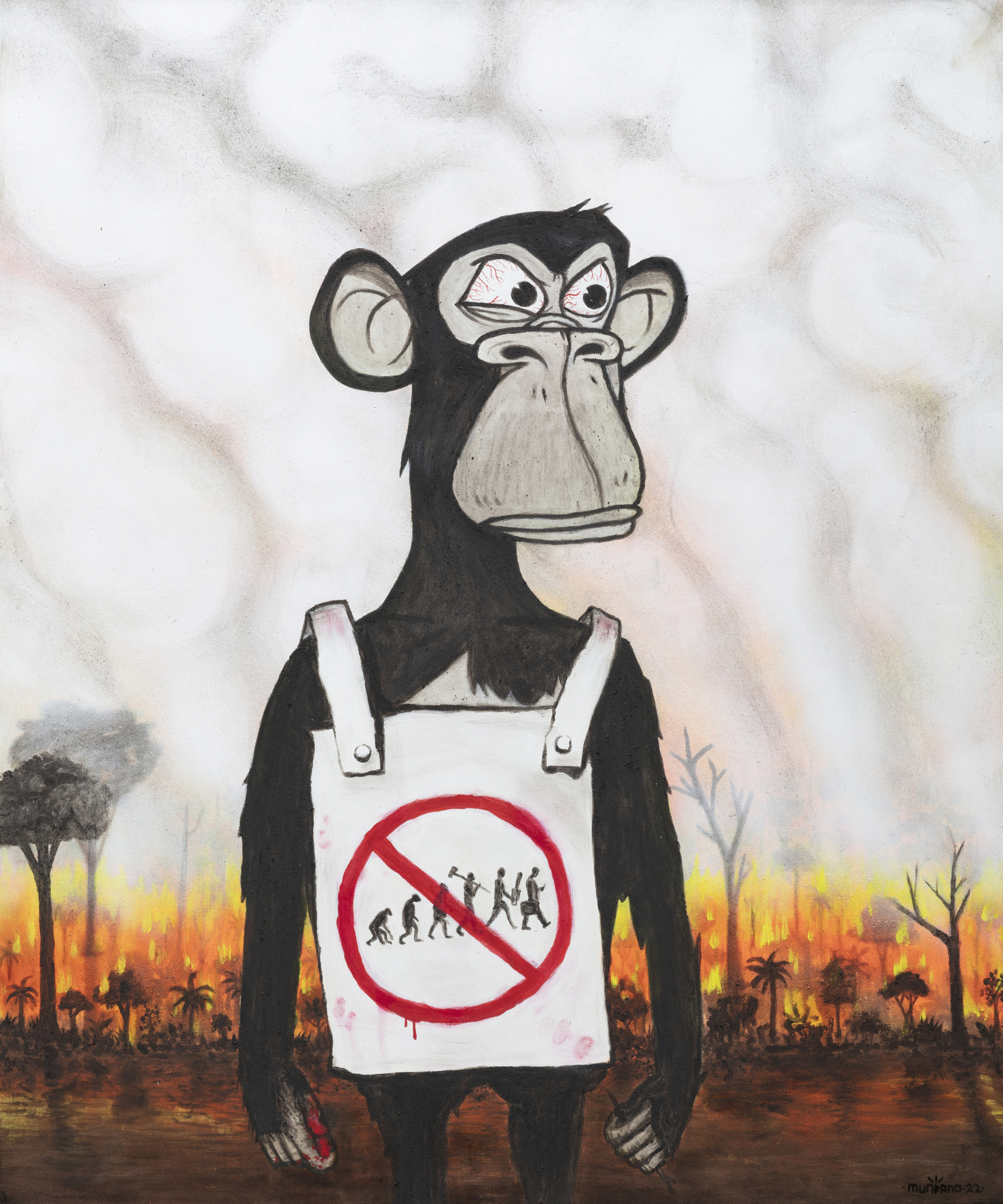 Mundano, Evolution, 2022, 120 x 100 cm, Paint made of toxic mud from Brumadinho’s mining crime, oil spillage from brazilian beaches, ashes from the forest, acrylic and spray paint over canvas.
